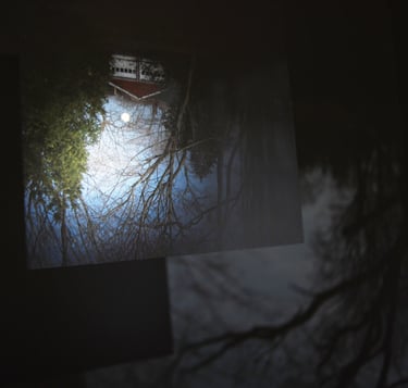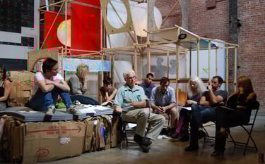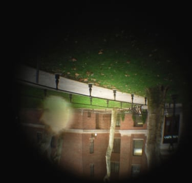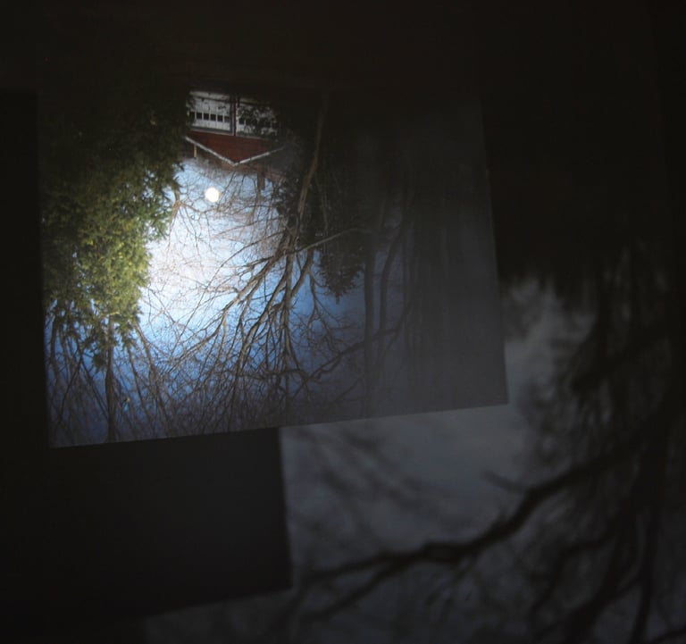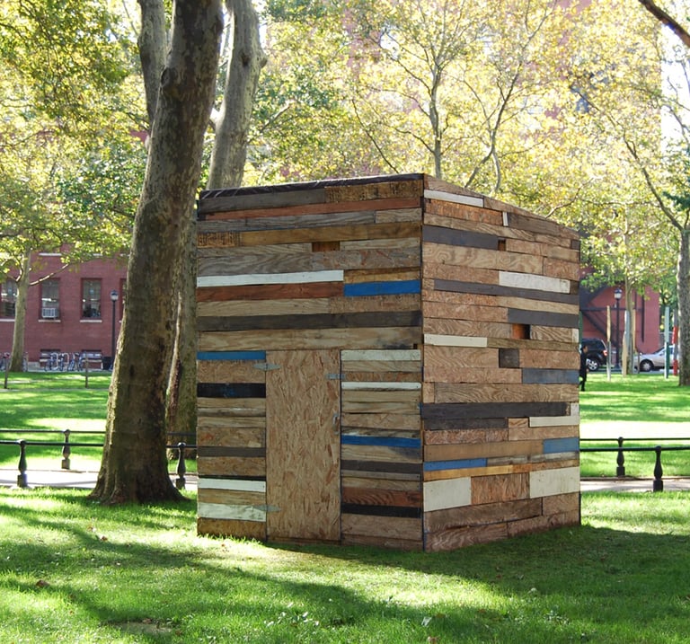 This one room dwelling made of discarded construction material is a free standing sculpture/ installation. Through the use of extremely crude optics and store bought eyeglasses the interior is transformed into a walk-in camera obscura, a place of unexpected beauty.