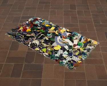 The evident of a violent disturbance is here aestheticied. The hard lines of this geometric shape barely contain the vibrant, colorful broken shards, inviting the viewer to imagine the explosive energy which destroyed these wares.