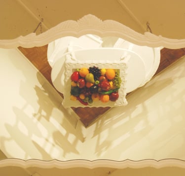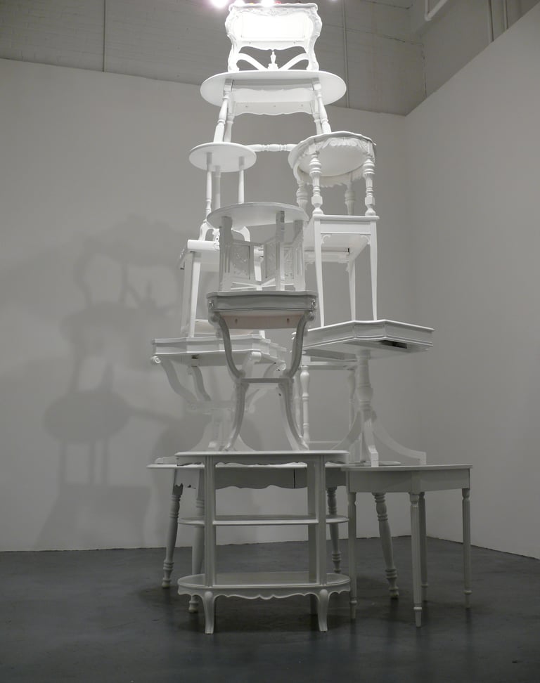 This stack of ornate, stark white tables rises to fill the vertical space of the gallery. Atop this striking grouping of forms (and invisible to the ground level observer) is a tabletop bearing a lavish display of fruit. It is only through a mirror suspended from the ceiling that the viewer glimpses this alluring yet ultimately unreachable bounty.