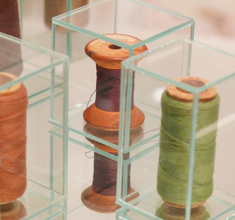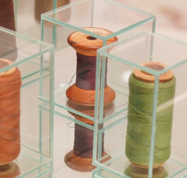Dozens of colorful spools of thread rest on a mirror-topped pedestal in individually sealed, handmade glass cases. Through careful display these quotidian objects have become celebrated and rarefied artifacts. The spools (which I found while cleaning out my grandfather’s apartment after his death) invite the viewer to reflect upon the elusive connections between family and memory, labor and loss.