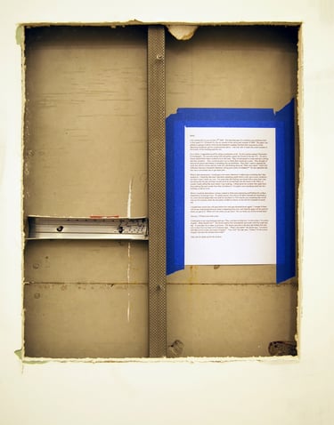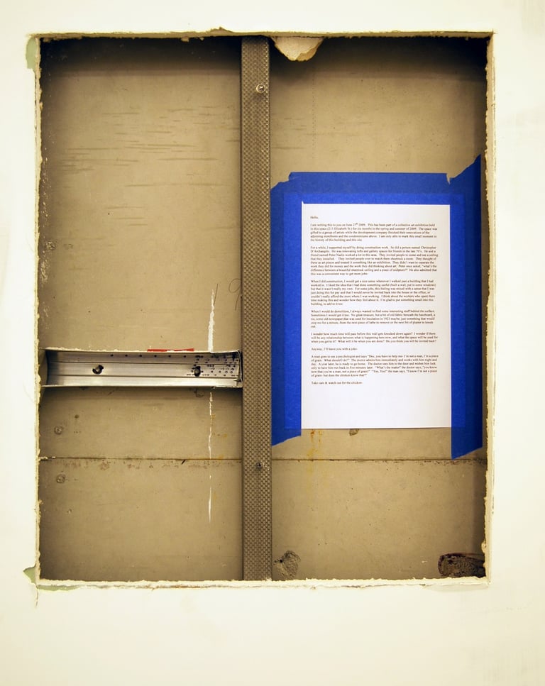 A 2 foot by 3 foot rectangle is cut from the wall of the gallery. Upon the substructure of the wall is taped a letter addressed not to the exhibition audience, but to the worker who will find the note during some future renovation. This piece is a meditation on divisions within labor, the production of exhibition and art spaces and the idea of cultural capital. It also acts as a eulogy to the artist Christopher D’Archangelo who committed suicide just one block from the gallery space.